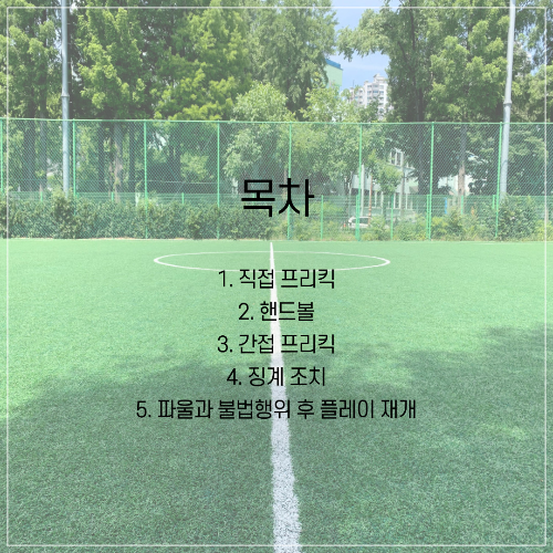 - 상대 선수에게 반칙 - 간접프리킥, 직접프리킥, 페널티킥